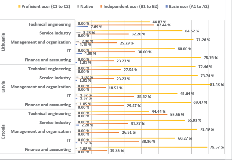 One of the most important requirements for an employee across three Baltic countries and investigated business sectors is high English language proficiency. 10 in 10 (98.03 %) of employers listed a demand for English language skills. The proportions of English language knowledge demand are similar across all investigated sectors.