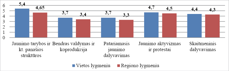Pagal Metodiką šios savivaldybių srities vertinimo maksimalus galimas balas yra 4,6 ir jis apima tokius rodiklius, kaip jaunimo interesų atstovavimas per savivaldybių Jaunimo reikalų tarybas (patvirtinta ir veikianti taryba, jos posėdžių skaičius, pasiūlymų, susijusių su jaunimo politikos įgyvendinimu, pateiktų savivaldybės administracijai, tarybai ir t. t.) bei jaunimo įgalinimo ir dalyvavimo skatinimas (pvz., iš savivaldybės biudžeto lėšų skiriamas finansavimas jaunimo iniciatyvoms ir projektams įgyvendinti, jaunimo verslumo skatinimas, veiklose dalyvaujančių jaunų žmonių skaičius ir t. t.). Jaunimo reikalų agentūros (2021) vertinimu, 2020–2021 m. savivaldybėse bendras šios srities vertinimo balas vidutiniškai padidėjo nuo 2,64 iki 2,72 (t. y. 2,8 proc.), tačiau, nepaisant bendrų augimo tendencijų, 2021 m. jis siekė tik 59,05 proc. maksimalaus galimo įvertinimo ir net 23 savivaldybėse vertinimas balais šiuo laikotarpiu sumažėjo (vidutiniškai 0,54 balo).