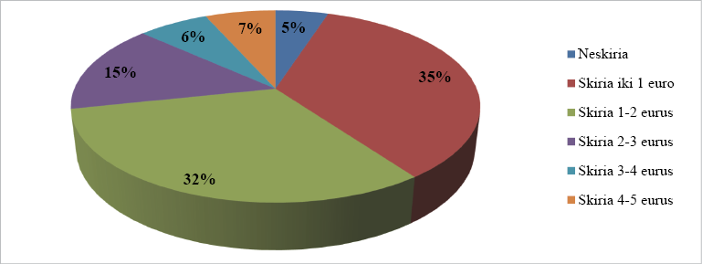 Atsižvelgiant į jaunimo demografinius skirtumus savivaldybėse, vertinti tik skiriamos sumos dydį nebūtų objektyvu, tad finansavimo netolygumams atskleisti buvo vertinamas jaunimo ir jaunimo projektų konkursiniam finansavimui panaudotos sumos santykis (2 pav.). Remiantis šiais duomenimis, vidutiniškai tose savivaldybėse, kuriose skiriamas finansavimas, vienam jaunuoliui tenka 1,67 eurų, bet net 21 savivaldybėje skiriama mažiau nei 1 euras (vidutiniškai jose tenka po 0,69 euro).