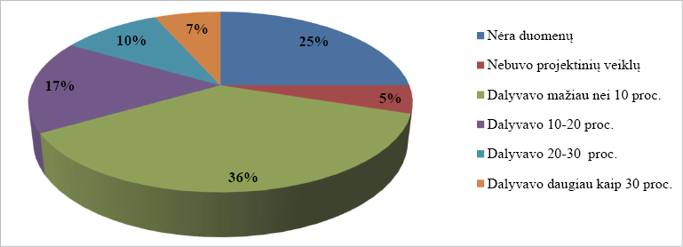 Analizuojant kaip šis skiriamas finansavimas 2021 m. prisidėjo prie galimybių jaunimui įsitraukti į įvairias veiklas bei leido jiems įgyvendinti savo idėjas, pastebėta, jog ne visos savivaldybės tokius duomenis renka ir sistemina. Jaunimo reikalų agentūros teikiamose ataskaitose nurodyta, kad tokių duomenų nepateikė net 15 savivaldybių (arba vietoj jų pateikė įgyvendintų projektų, o ne įtrauktų dalyvių skaičių). Analizuojant kitų savivaldybių duomenis (3 pav.) matoma, jog šis finansavimas ir jo metu vykdomos veiklos įprastai pasiekia itin nedidelę savivaldybių jaunimo dalį (vidutiniškai 13,21 proc.).
