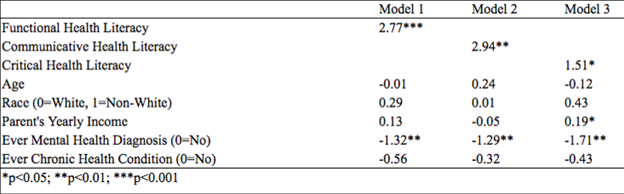 Functional, communicative, and critical health literacy were all positive predictors of self-efficacy (p < 0.05), with the functional and communicative health literacy relationships having moderate effect sizes (d = 0.26 and 0.27, respectively). Previous mental health diagnosis was a significant predictor in all three models, having a negative relationship with self-efficacy (p < 0.05), and parents’ yearly income was statistically significant in the critical health literacy model (p < 0.05). Age, race, and ever having had a chronic health condition were not significant predictors in any of the models.