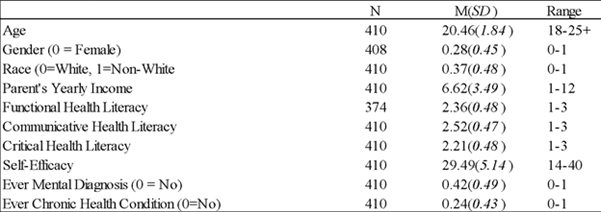 Despite the wealth of research on such protective factors, little has focused on the relationship between students’ self-efficacy (one’s belief in their abilities; Bandura, 1994), and their health literacy (one’s ability to read, understand, and apply health information; Sykes et al., 2013), the two factors that can promote well-being and health behaviors among university students. Thus, the purpose of this study is to examine the relationship between self-efficacy and health literacy among a sample of students attending universities throughout the US.