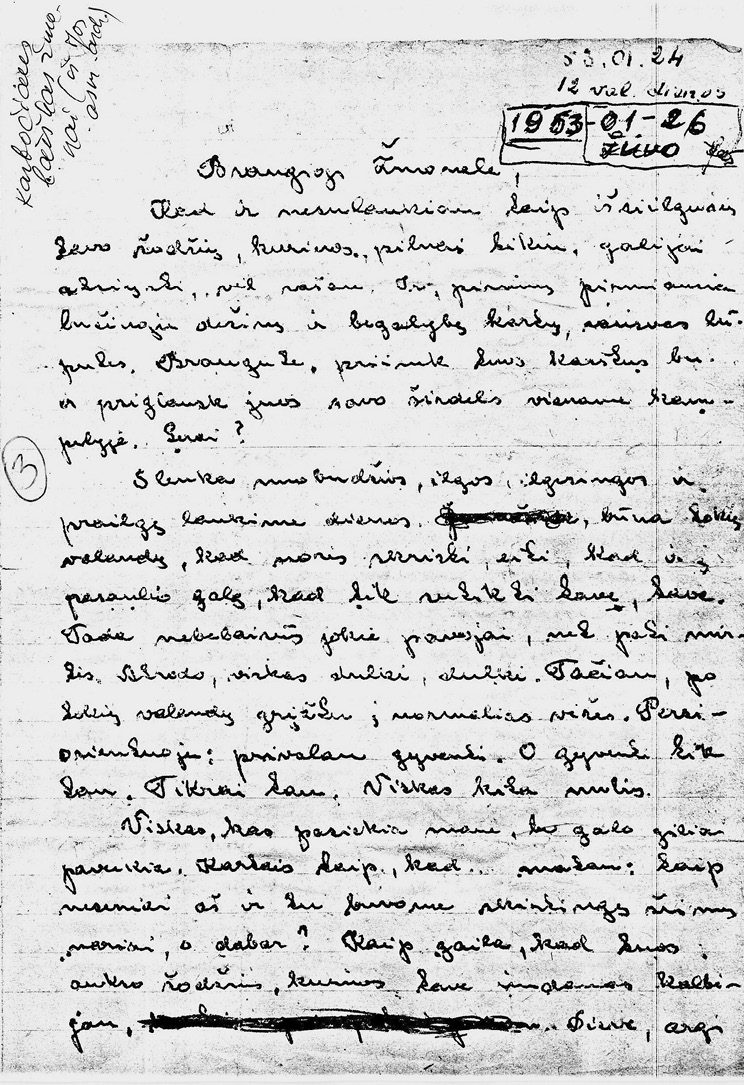 3 Pastebėtina, kad istoriką trikdo tokia katalogo struktūra, nes pirmiausia turėtų būti pateikiami partizanų, toliau – politinių kalinių ir tremtinių laiškai.