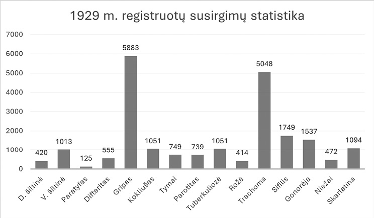 Kiekviename 1920–1940 m. leisto žurnalo Medicina numeryje būdavo pateikiama sergamumo įvairiomis ligomis statistika. Kaip rodo skelbti duomenys, per mėnesį naujų sifilio atvejų galėdavo būti užregistruojama nuo 22 (Med 1925 8: 618) iki 283 (Med 1928 5: 383). Nuo 1926 m. kas mėnesį (su nedidelėmis išimtimis) sifiliu užsikrėtusių žmonių buvo užregistruojama daugiau kaip 10017. Net baigiantis trečiajam dešimtmečiui statistika neatrodė džiuginanti. Sifilis ir gonorėja (liaudyje dar vadinta triperiu) buvo trečioje ir ketvirtoje vietose tarp užkrečiamųjų (tuo metu vadintų limpamomis) ligų (žr. pav. 1):