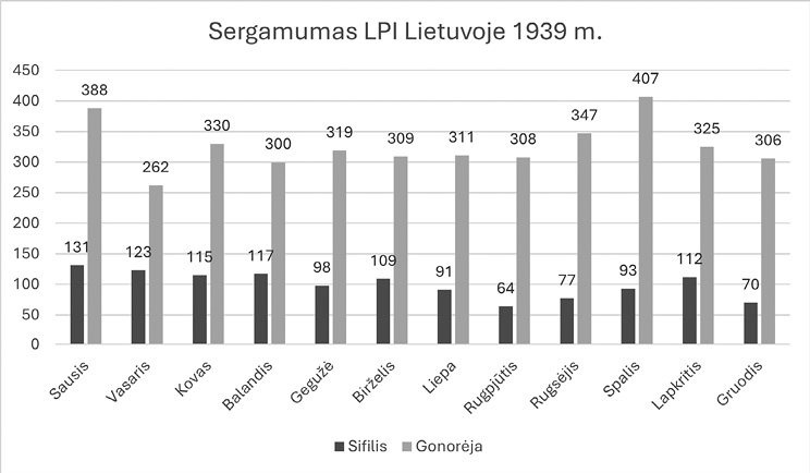 17 1926 m. kovo mėnesį užregistruoti 129 susirgusieji sifiliu (Med 1926 3–4: 213), rugpjūtį – 104 (Med 1926 8–9: 491), kitais mėnesiais jų skaičius nesiekė šimto. Tačiau 1927 m. 100 naujų registruotų susirgimų per mėnesį riba perkopiama vasarį, birželio–rugsėjo mėnesiais, lapkritį ir gruodį (žr. 1927 m. Medicinos numerius), o 1928 m. tik rugpjūtį ir rugsėjį naujų atvejų kiekis nesiekia šimto (Med 1928 9: 640; Med 1928 10: 706).