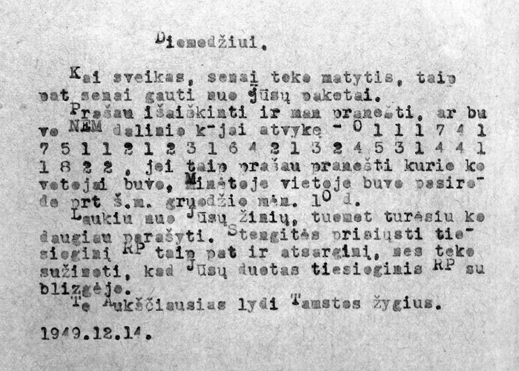 3. Prisikėlimo apyg. Maironio rinkt. vado J. Paliūno (spėjama) dalinai šifruotas laiškas, adresuotas tos pačios rinktinės Mindaugo tėvūnijos vadui K. Kudokui-Diemedžiui, 1949-12-14. Nuorašas Maironio rinkt. archyve – LYA, f. K–5, ap. 1, b. 44, l. 209
