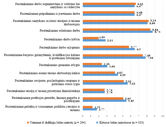 2.4. viename iš didžiųjų šalies miestų (Kaune, Klaipėdoje, Panevėžyje, Šiauliuose, Vilniuje) dirbantys teisėjai, palyginti su dirbančiaisiais kituose šalies miestuose, yra daug mažiau patenkinti darbo sąlygomis (p < 0,05) ir daug labiau nepatenkinti darbo krūviu (p < 0,01), gaunamu atlygiu (p < 0,01), taip pat politikų ir visuomenės požiūriu į teisėjus bei teismus (p < 0,01);