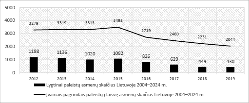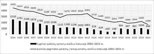 34 Parengta vadovaujantis Kalėjimų tarnybos viešai skelbiamų ataskaitų duomenimis (2024–2018 m.) bei G. Sakalausko, L. Jarutienės, V. Kalpoko, R. Vaičiūnienės parengtos monografijos „Kalinimo sąlygos ir kalinių socialinės integracijos prielaidos“, p. 404, 90 pav. pateikta statistika (2017–2004 m.).