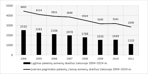 42 Parengta vadovaujantis Kalėjimų tarnybos viešai skelbiamų ataskaitų duomenimis (2024–2018 m.) bei G. Sakalausko, L. Jarutienės, V. Kalpoko, R. Vaičiūnienės parengtos monografijos „Kalinimo sąlygos ir kalinių socialinės integracijos prielaidos“, p. 404, 90 pav. pateikta statistika (2017–2004 m.).